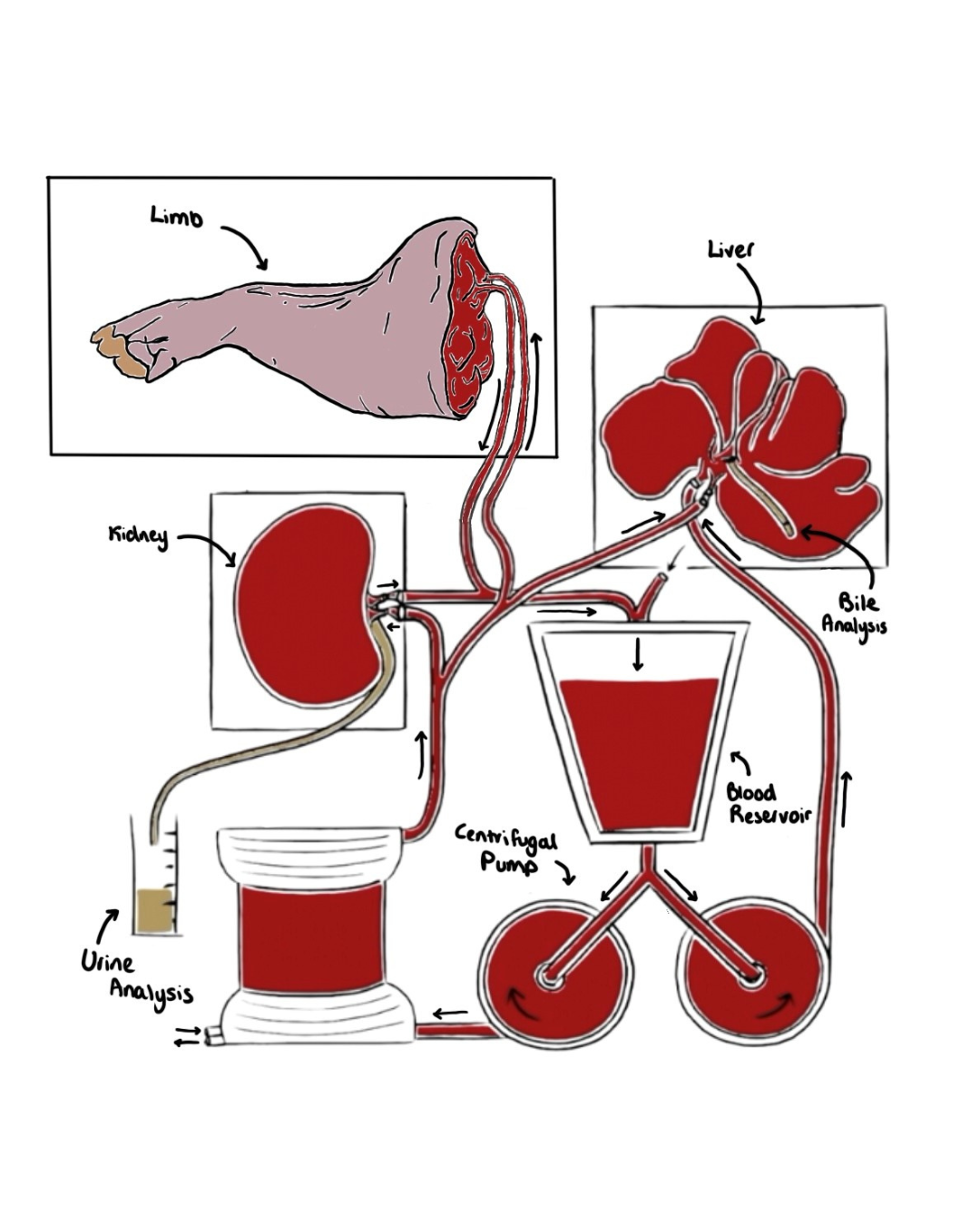 We can perform assays on plasma samples to establish concentrations of drug that have been absorbed. Drug metabolite concentrations can also be assessed when the limb is perfused with the liver in the Pebble MULTI-ORGAN system. Perfusion of a limb with a kidney can allow for urine assays to be completed determining concentrations of drug excreted in the urine. Alternatively, perfusion of a limb with both a kidney and liver allows the assessment of metabolism and excretion.