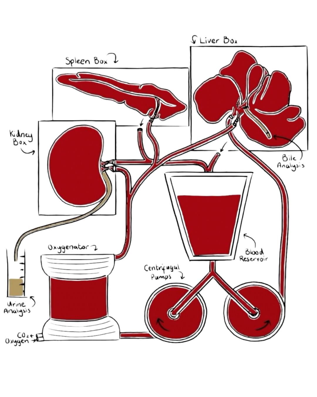 Organs are connected to the perfusion circuit via arteries and veins, and warm, nutrient-rich, oxygenated blood is passed through the vasculature. Venous outflow from each organ is collected in a single central reservoir and recirculated, enabling realistic assessment of tissue interactions following the addition of therapeutics.