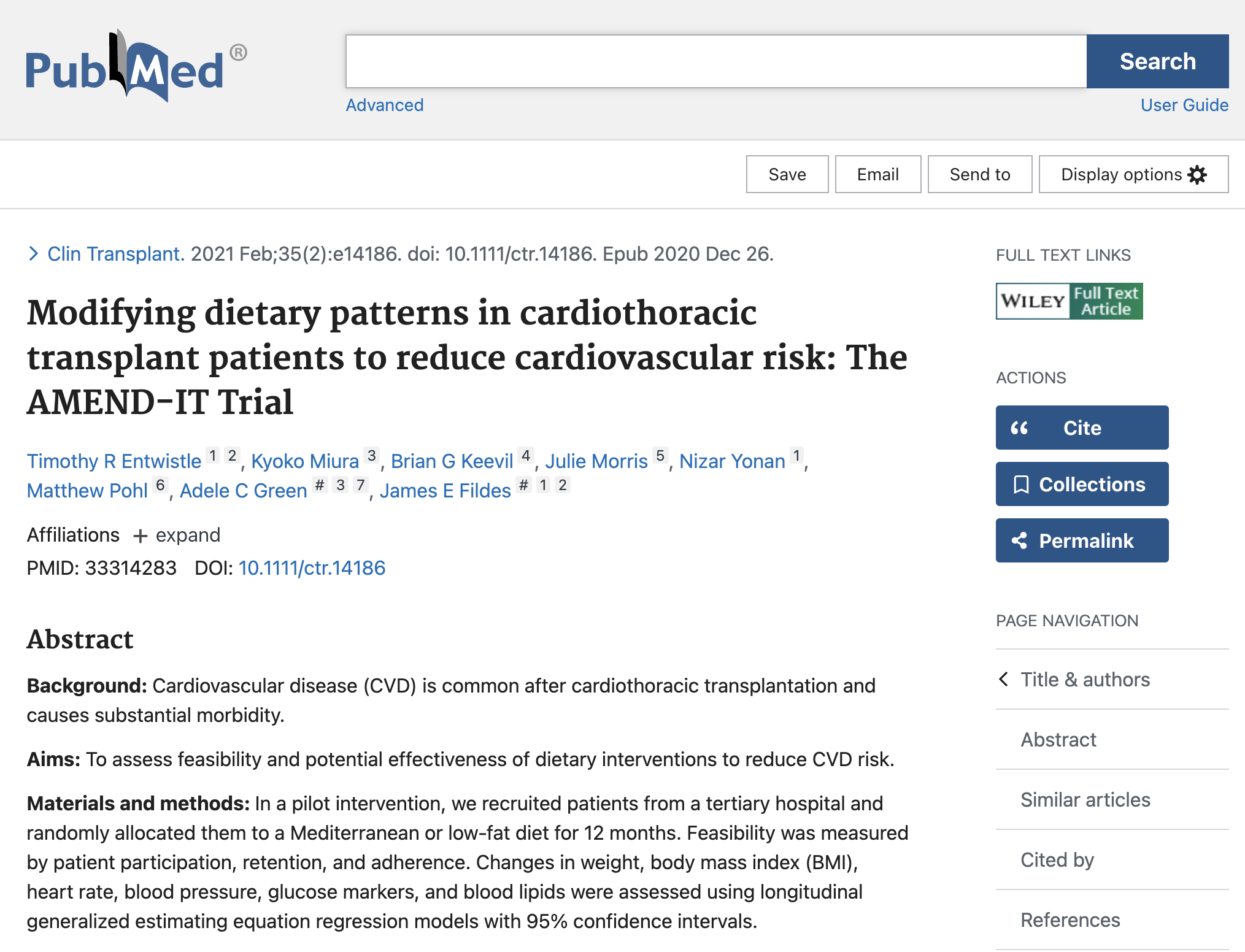 Adherence to Mediterranean and low-fat diets among heart and lung transplant recipients: a randomized feasibility study. Entwistle TR, Green AC, Fildes JE, Miura K. Nutr J. 2018 Feb 14;17(1):22. doi: 10.1186/s12937-018-0337-y.